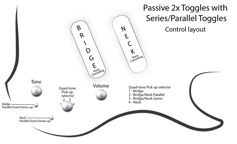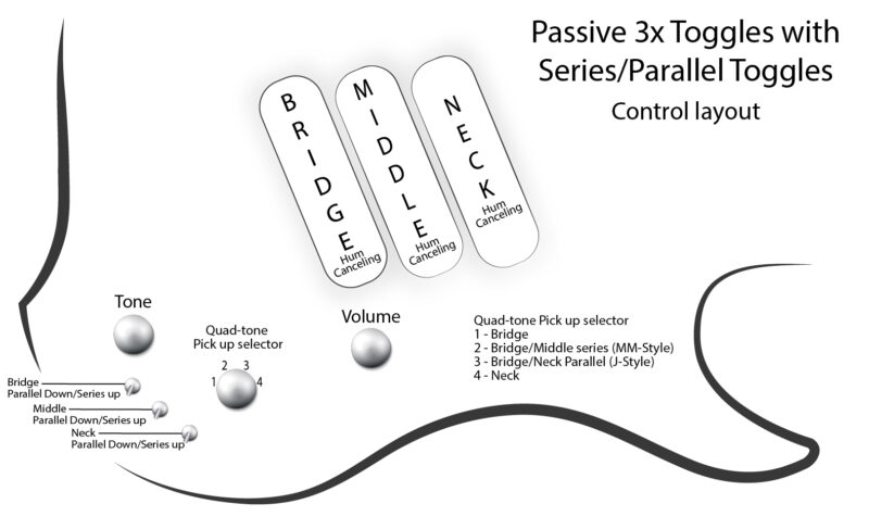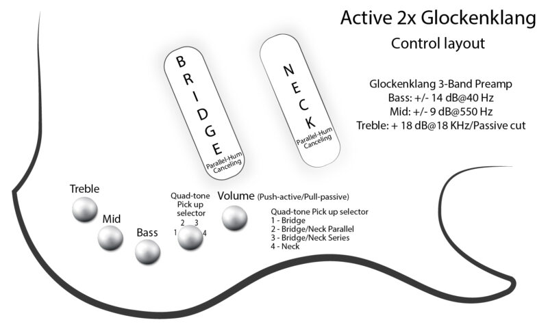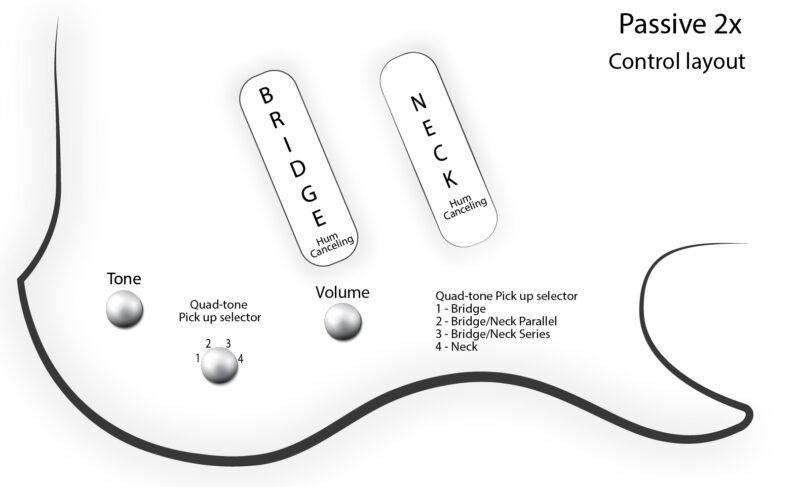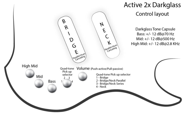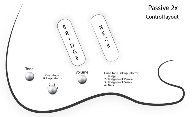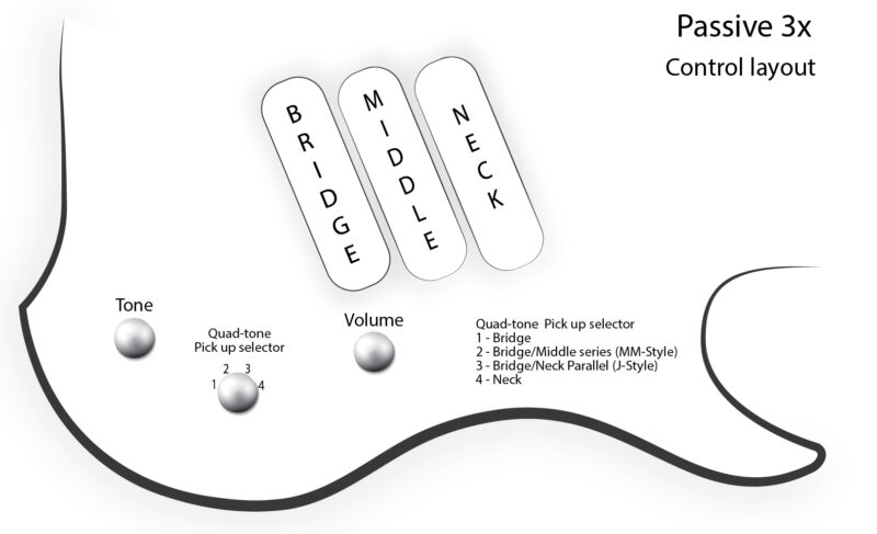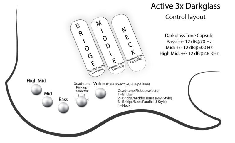 Master volume, 4-position Quad-tone pickup selector, active 3-band EQ, active/passive toggle switch.
