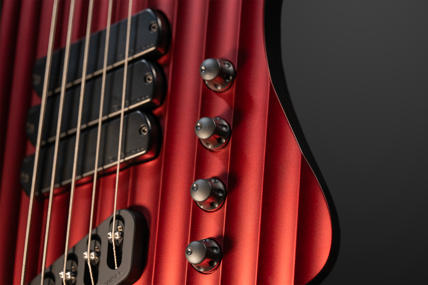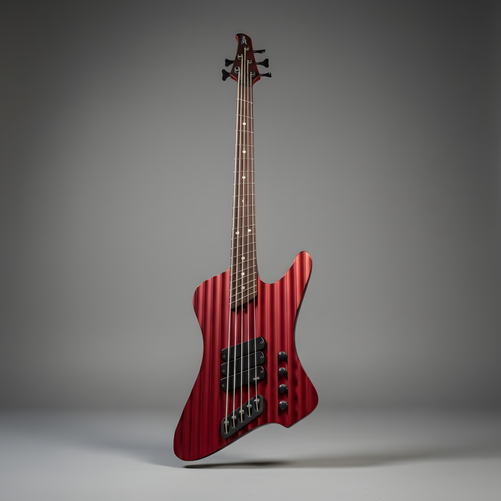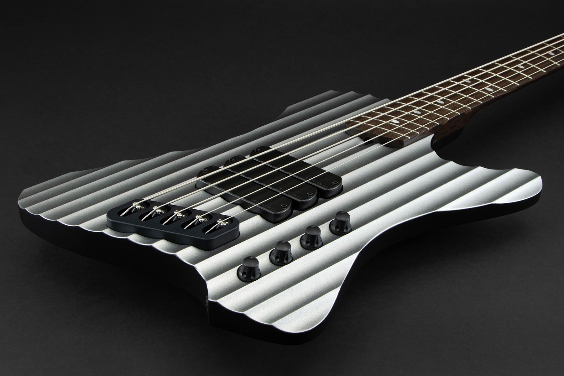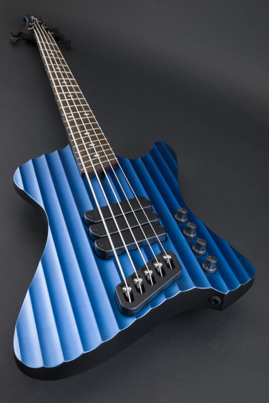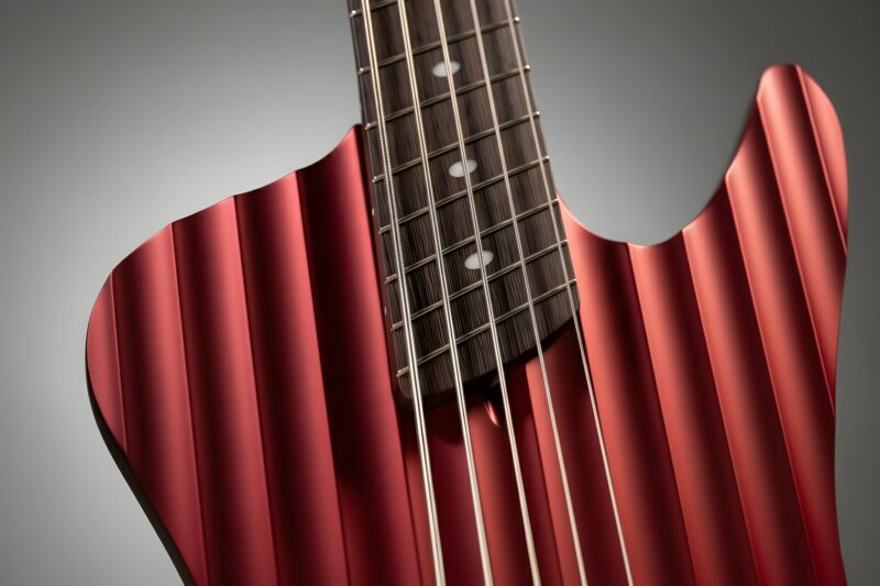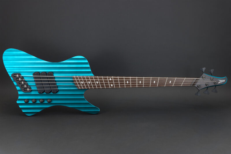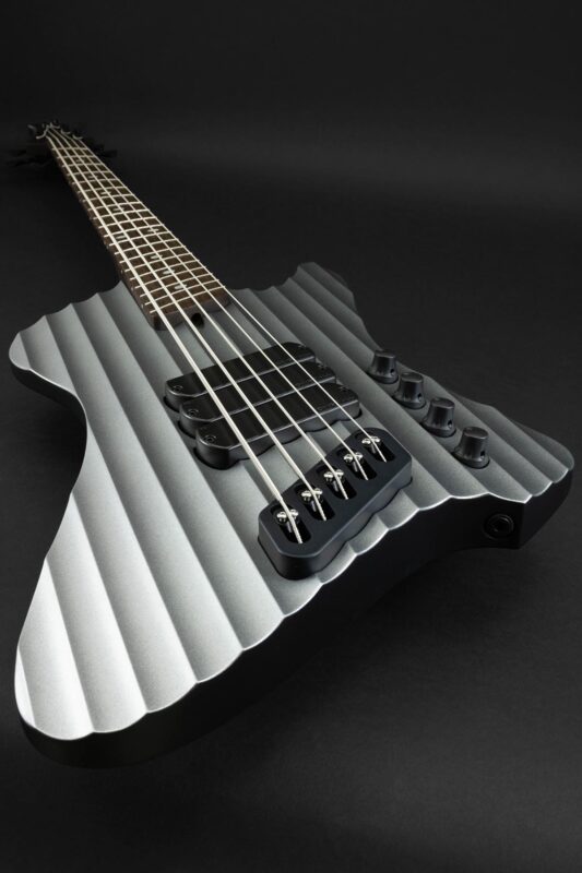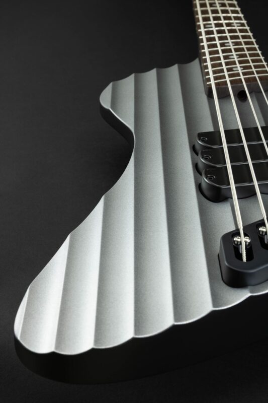 The body follows the D-Roc template, with a sizable cutaway to allow extended access to the upper-range frets. It’s built using Fijian Mahogany, and the top has been carved to create the illusion of brushed or machined aluminum, catching stage light with shifts in colour, while the sculpted contours and wenge neck and fretboard add a modern, aggressive edge — a bass that looks precision-engineered from solid metal, yet resonates with the warmth of handcrafted wood.